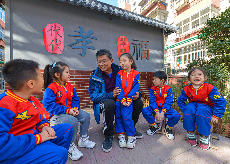 在河北省邯郸市邯山区开展的“听爷爷奶奶讲家风”主题活动中,宣讲员向孩子们讲家风家训故事(2020年11月2日摄)。